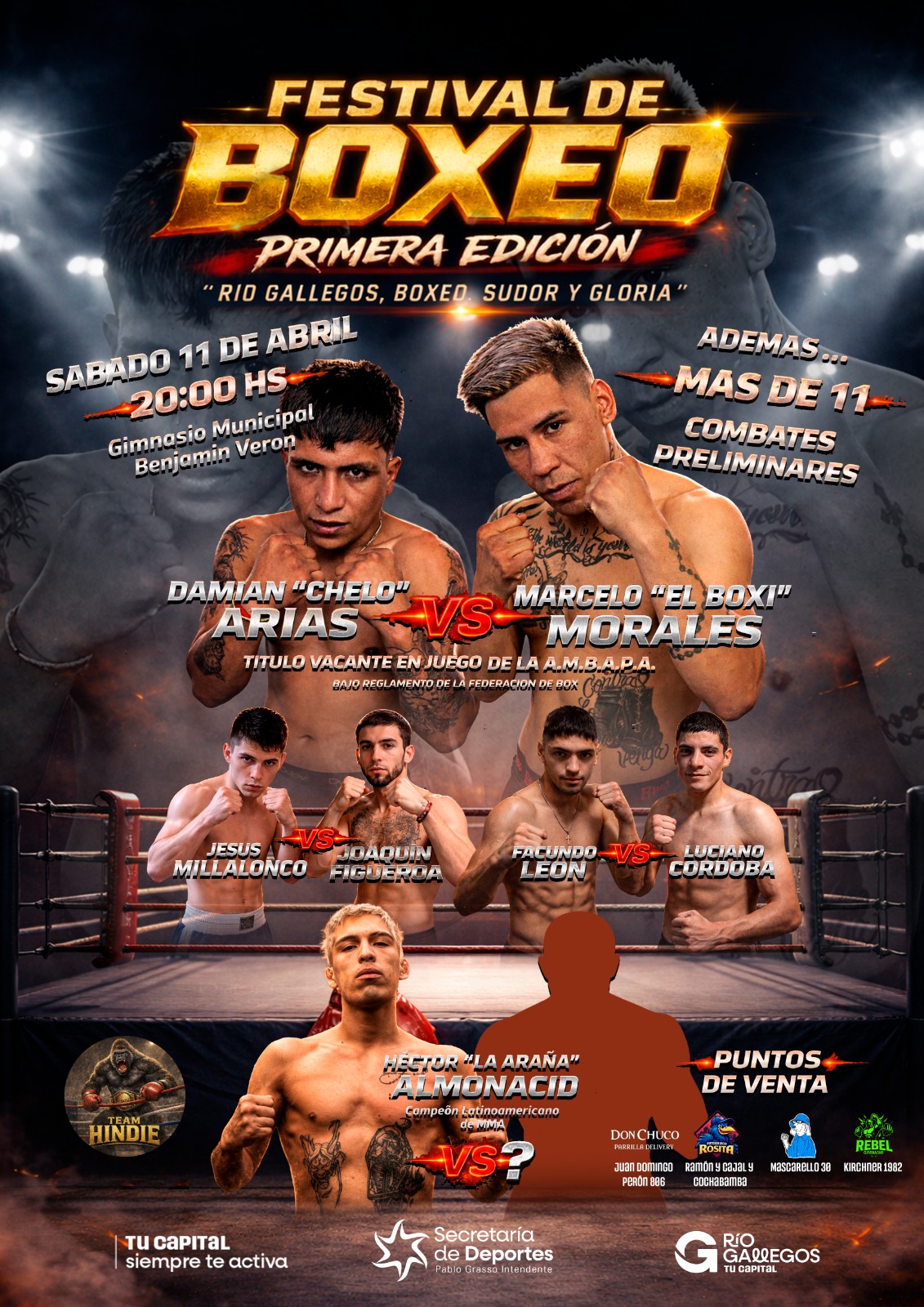 Habrá representantes de Comodoro Rivadavia, Río Grande, El Calafate, Puerto Santa Cruz y Punta Arenas en lo que será un generoso encuentro del boxeo regional. Uno de los grandes atractivos será el debut en boxeo del campeón latino de MMA, Héctor “La Araña” Almonacid (Team Hindie) quien se medirá con Kevin Vallejos (El Calafate – Dojo Sensei) en la categoría hasta 75 kgs. Se destacán además los cruces que protagonizarán Facundo León (Sulsa Elite) ante el subcampeón nacional Luciano Córdoba quien representa a Camioneros Río Grande hasta 69 kgs. y el siempre aguerrido Jesús Millalonco quien se medirá con el fueguino Joaquín Figueroa (Troco Pérez) en la división hasta 69 kgs.